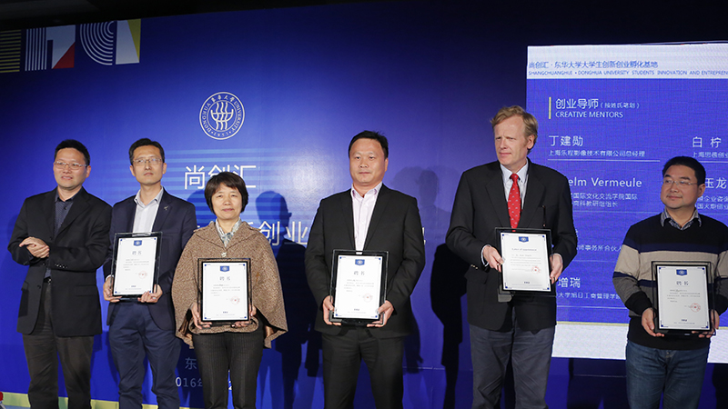 仪式上,孵化基地运营方——上海东华镜月资产经营有限公司下属全资子公司上海新因子众创空间管理有限公司与上海苏河汇投资管理股份有限公司等5家创业投资机构签订战略合作协议,用市场化手段推动我校创新创业教育发展,提升大学生创新创业能力。