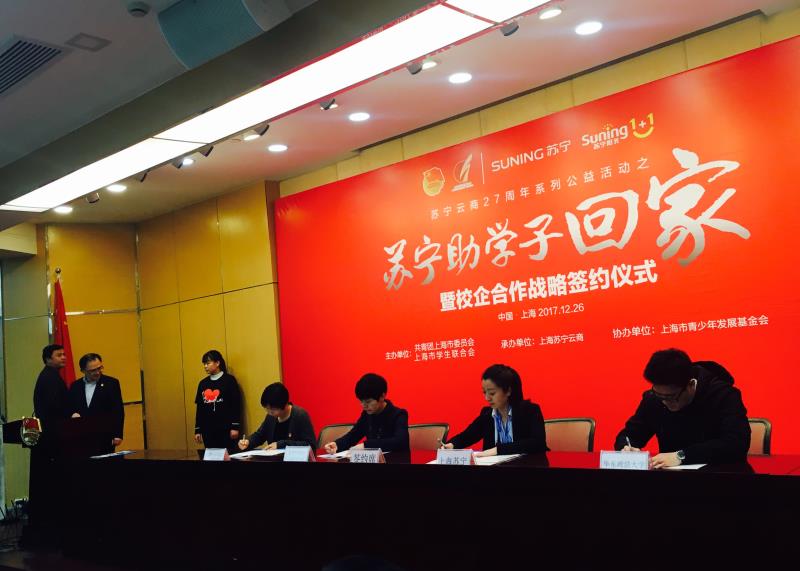 据了解,2013年到2016年期间,苏宁联手团市委致力于资学助教领域公益活动,打造“送贫寒学子回家”公益项目,苏宁每年捐赠50万元给予家庭经济困难学子,受助学生逾3000名,学生覆盖20多个省份,40多所高校。目前沪上已有复旦、交大、同济、财大、东华等9所高校参与团市委与苏宁的该项公益活动。今年,我校管理学院首次与苏宁云商开展涵盖“送贫寒学子回家”公益项目的“一揽子”战略合作计划。