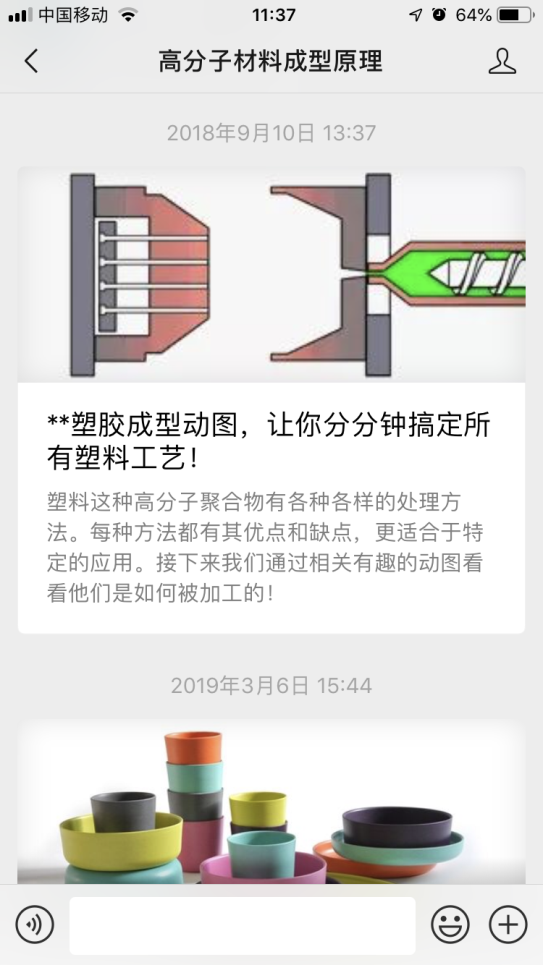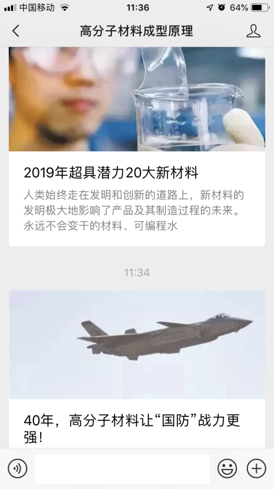 课堂教学是正餐,课后延伸是小食,为了激发学习的热情,充分利用课外时间拓展专业知识,高分子物理学微信公众号、高分子材料成型原理微信公众号应运而生,“中国高分子科学奠基人”、“数诺奖人物还看今朝”、“从港珠澳大桥浅谈黏弹性阻尼材料”、“2019年超具潜力20大新材料”……从历史传承、现实热点到学科前沿,这些生动活泼的微信推送均出自材料学院学生之手,同学们在阅读相关文献的基础上归纳总结编排成微信推文,自2018年1月创建以来已累计发布一千余篇推文,“你讲我听满堂灌的方式已经被时代淘汰了,希望用学生喜欢的传播方式和方法去教学,让学生在课堂内外都愿意学、主动学。”张慧慧老师欣慰地说。