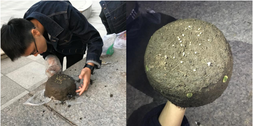 (学生就地取材用镜月湖畔泥土制作帽子)