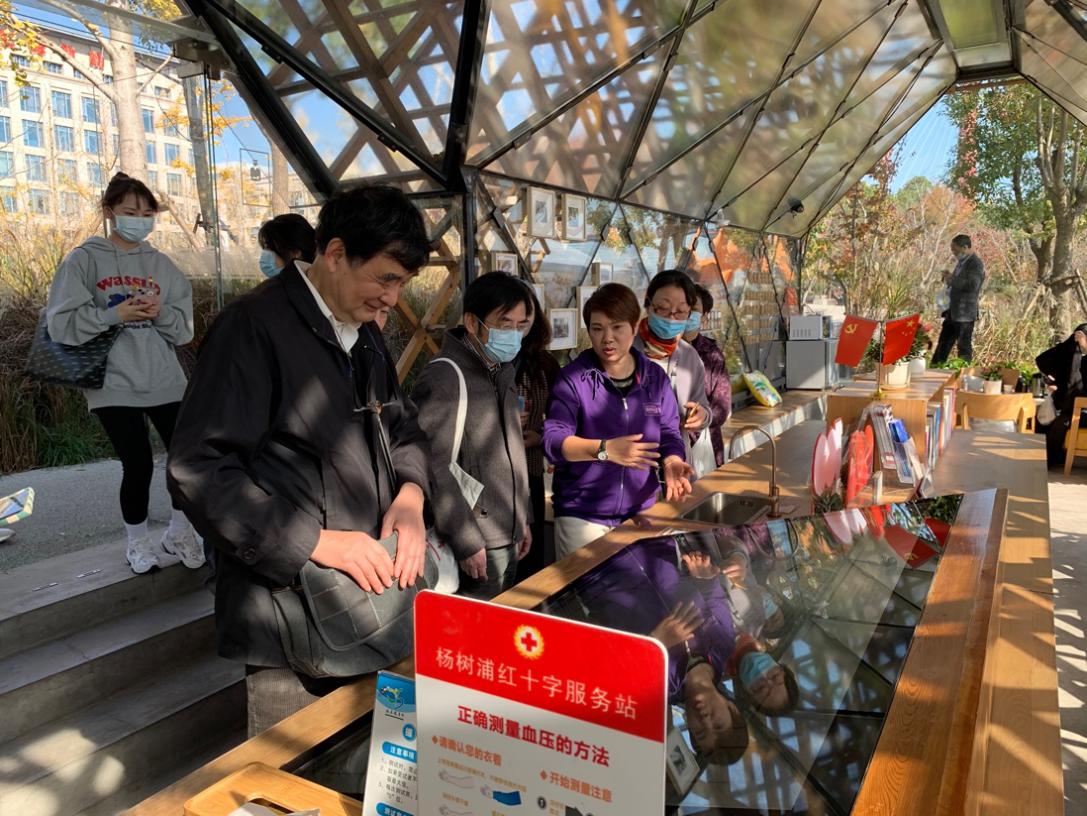 随后,师生探访了杨浦滨江人人屋党群服务站。该服务站以“人”字形木质结构回望工业历史,把党建与历史、人文融合在一起,呼应杨浦人对木行旧址的场地记忆,依托滨江智慧党建平台,跨区域、跨部门、跨行业共同打造滨江党建文化品牌项目。从讲解员处得知:“人人屋是一个给人民提供歇脚、休息的场所,屋内含有微波炉、小冰箱、雨伞等设备,并且有党员轮流值班服务。”从人、到物、再到屋,这里无一不体现着“以人民为中心”“为人民服务”的精神。行走在习近平总书记曾经到访过的地方,体悟上海基层党建领域发生的变化,党员们内心充满激动与敬畏,更加坚定了自己为人民创造美好生活的决心。
