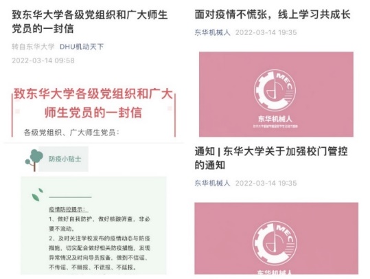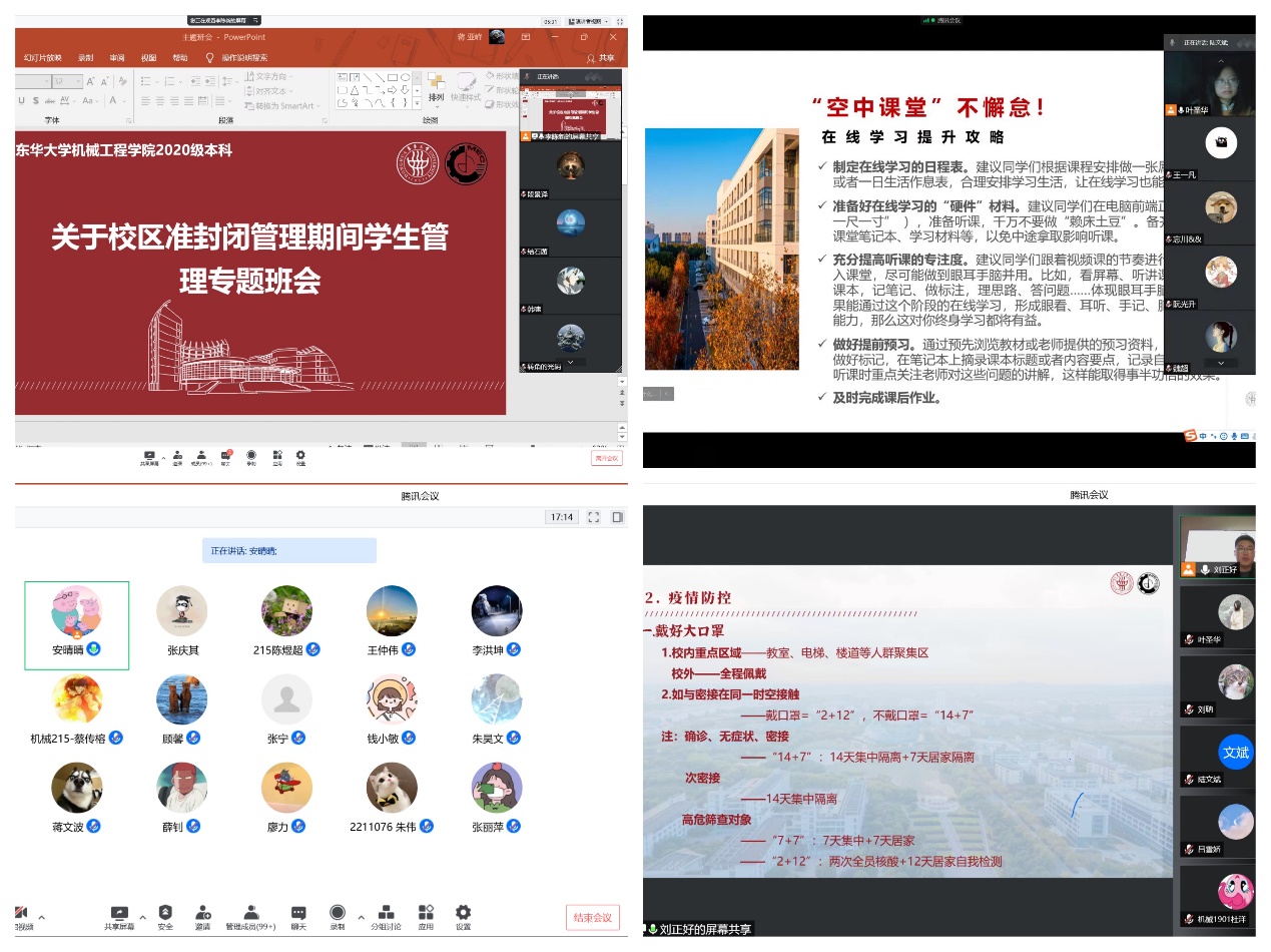 学院做到第一时间响应,统筹落实线上教学,就课程平台搭建、教学流程规范及相关注意事项作了具体安排。以线上咨询、讨论形式为切入点,根据同年级学生需求,有针对性做好咨询和帮扶;利用“机动天下”、“东华机械人”等平台营造同心抗“疫”、共促学风的良好氛围,引导学生做到疫情期间思想进步“不掉线”。